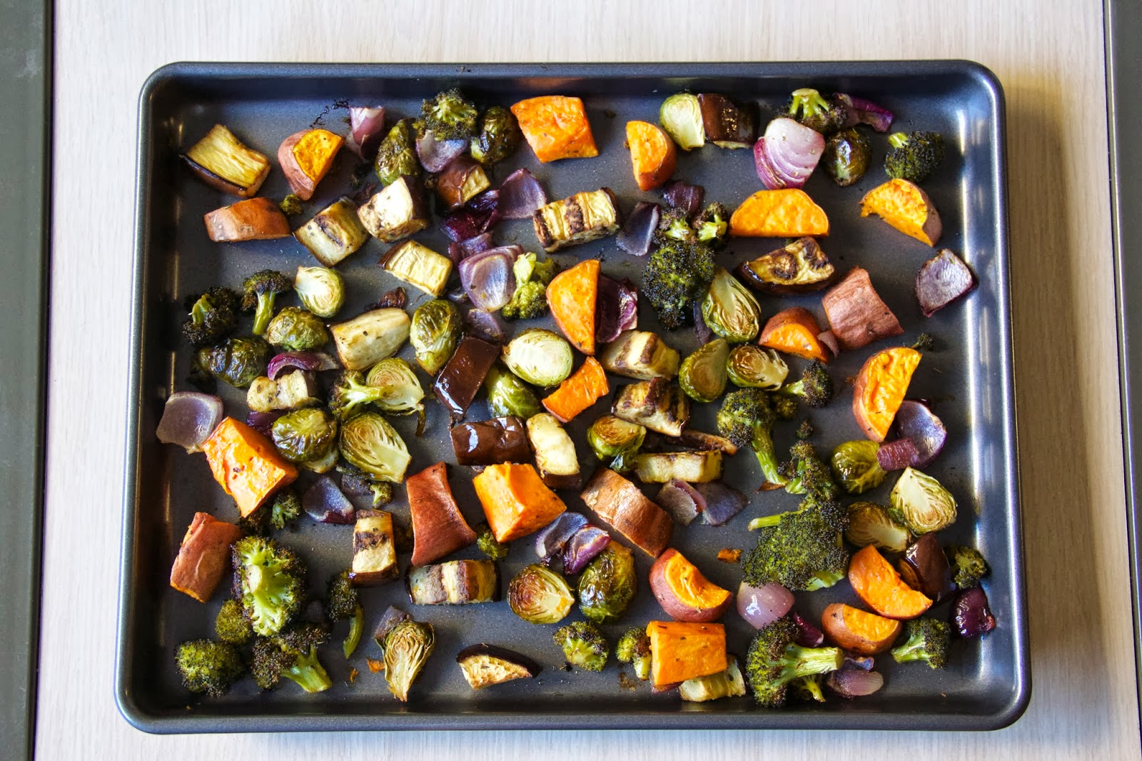 You'll know the vegetables are done when a fork inserted into the sweet potatoes goes in smoothly with no resistance. Soft the whole way throughout! The broccoli florets should be a little crispy and there should be some color on everything.
